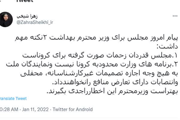 زهرا شیخی سخنگوی کمیسیون بهداشت و درمان مجلس شورای اسلامی درباره حضور وزیر بهداشت و سوال نمایندگان از وی در صحن مجلس در توییتی نوشت: پیام امروز مجلس برای وزیر محترم بهداشت ۲ نکته مهم داشت. ۱. مجلس قدردان زحمات صورت گرفته برای کروناست. ۲.برنامه های وزارت بهداشت محدود به کرونا نیست و نمایندگان ملت تحت هیچ شرایطی اجازه تصمیمات غیر کارشناسانه، محفلی و انتصابات دارای تعارض منافع را نخواهند داد. بهتر است وزیر محترم این اخطار را جدی بگیرند.